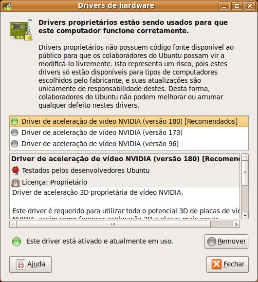 Para tanto, acesse o menu Sistema > Administração > Drivers de Hardware. Você irá observar uma janela semelhante à que aparece na imagem abaixo. Note que há uma lista de drivers que podem ser instalados através deste método.